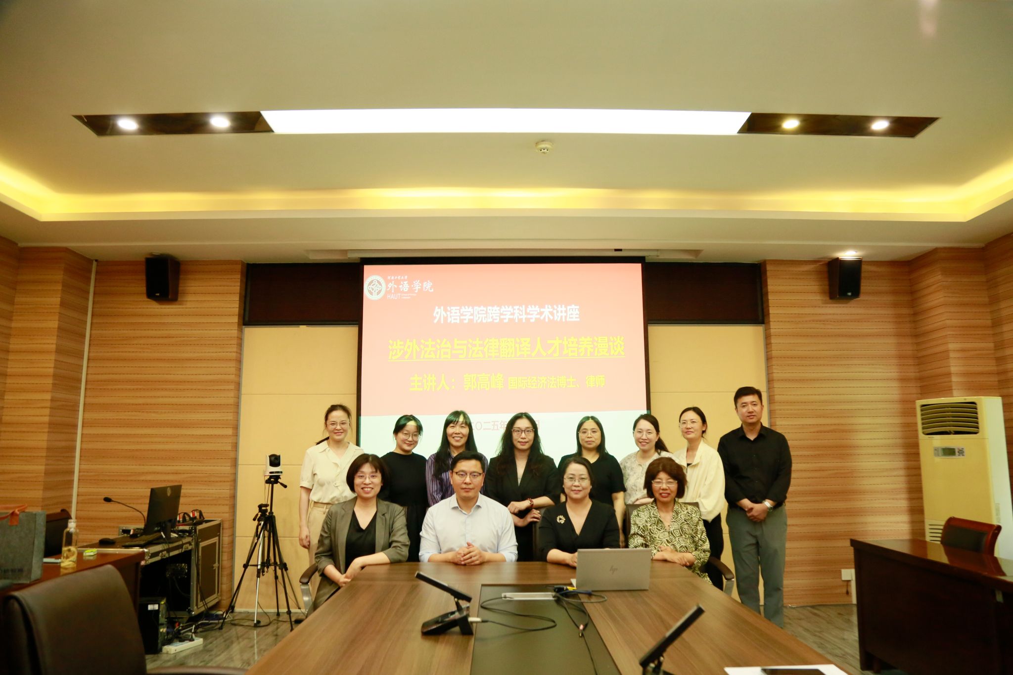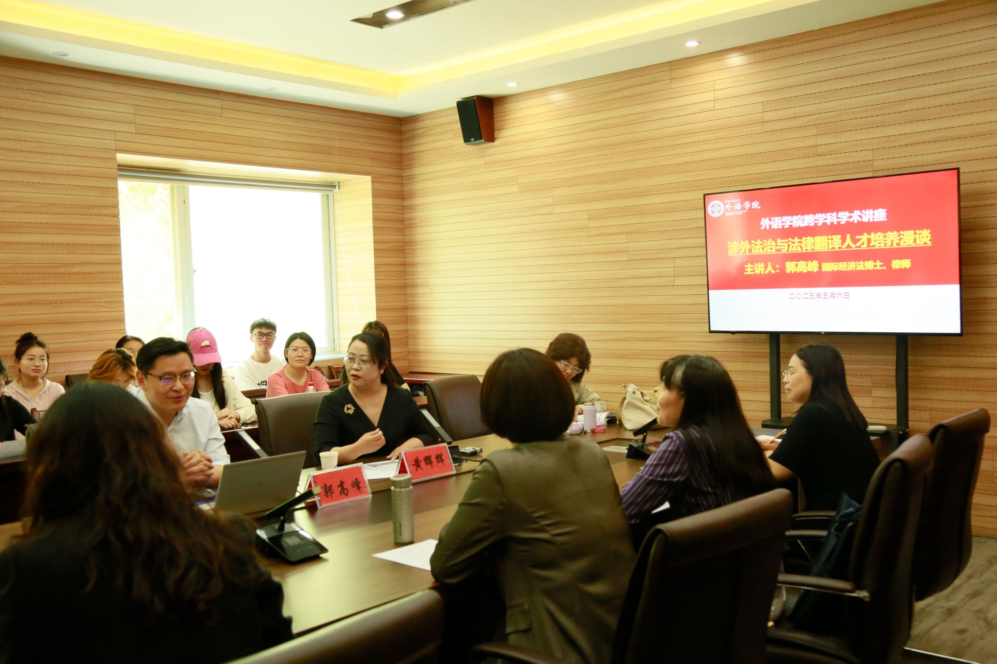 在5231会议室举行“涉外法律服务与法律翻译人才培养”跨学科学术讲座。西南政法大学的国际经济法博士、广东金桥百信律师事务所合伙人郭高峰律师应邀出席,与学院领导班子成员、各系部负责人及专业教师围绕高素质复合型外语人才培养路径展开研讨。本次讲座由院长黄辉辉主持。