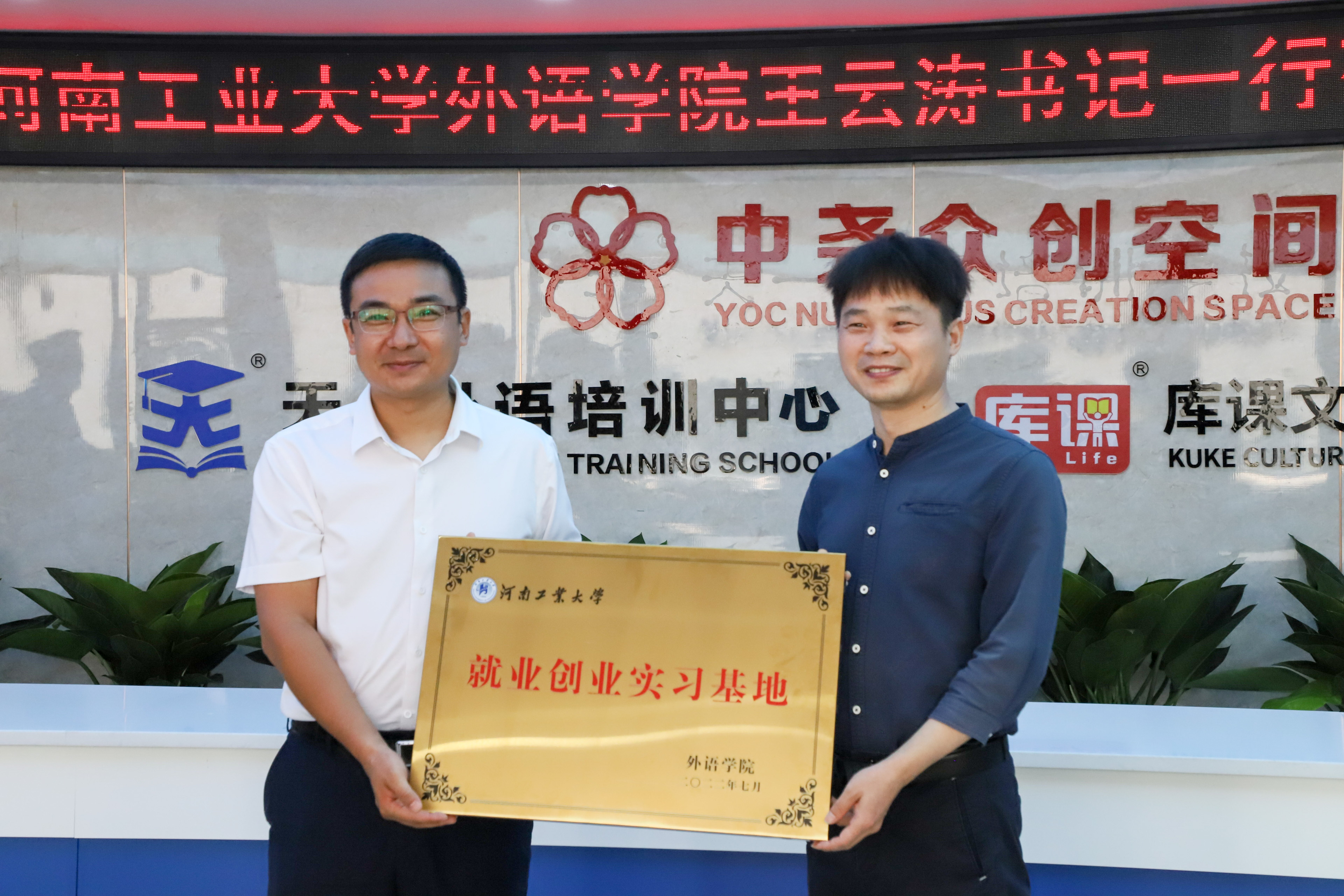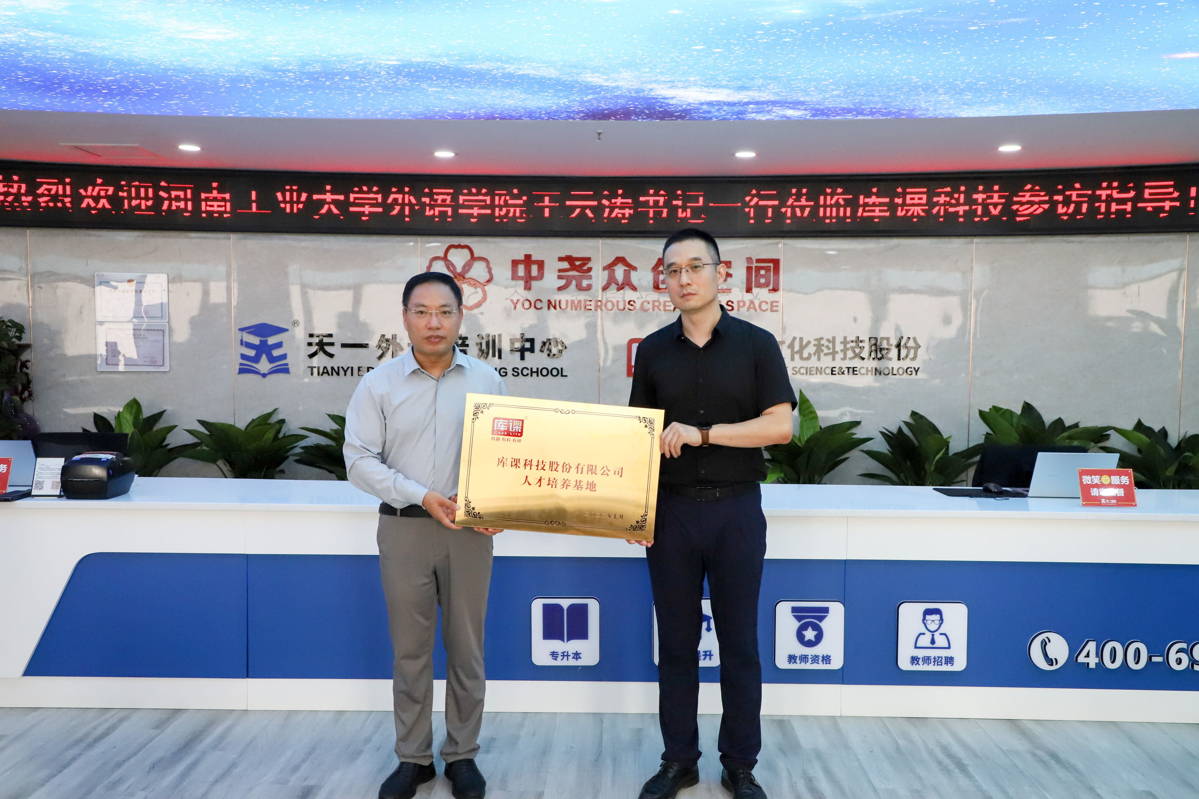 就业创业实习基地”“库课科技股份有限公司人才培养基地”牌匾。