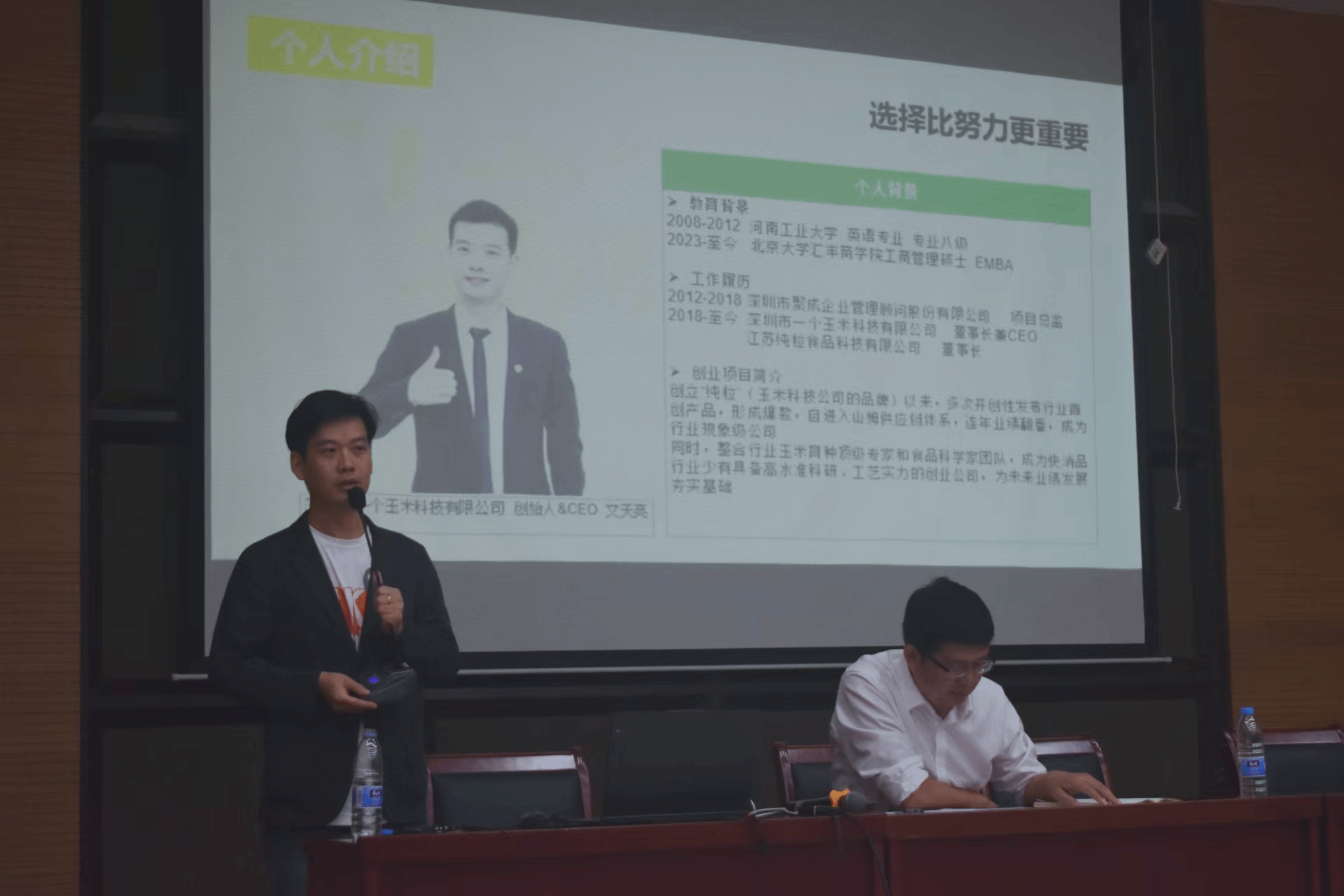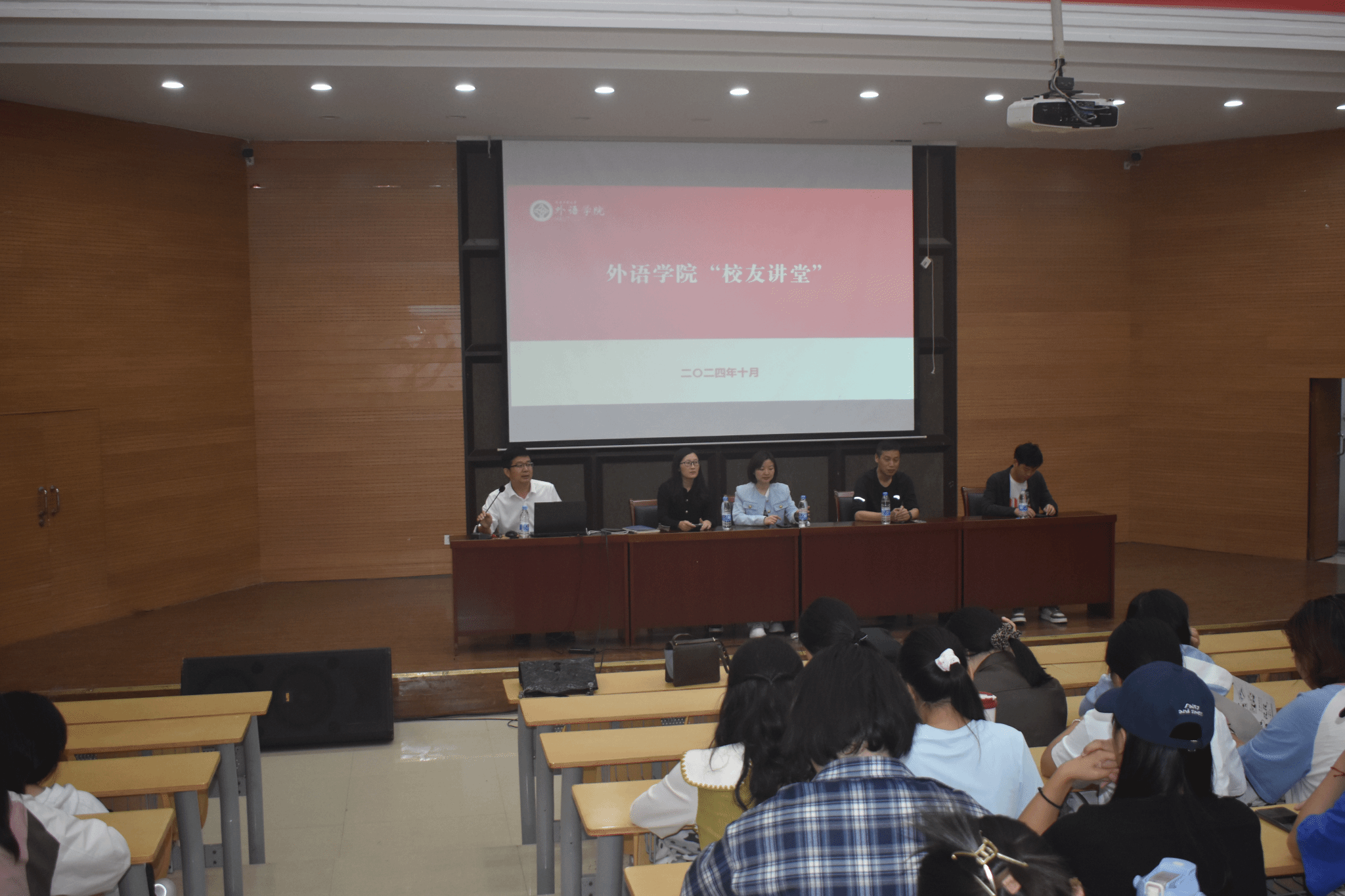 4位优秀校友,宁波华尔跃特进出口有限公司、宁波华尔跃特剃须刀有限公司、泰州顶锋剃须刀有限公司总经理平锦华,深圳市盈诺照明有限公司总经理李莉莉,深圳市龙志达实业有限公司、LINDONATHENA-COMERCIOGERAL(SU),LDA(安哥拉)总经理黄伟芳,深圳市一个玉米科技有限公司董事长兼CEO、江苏纯粒食品科技有限公司董事长文天亮,分别结合个人学习工作经历和创业实践,为广大学生做了精彩经验分享。