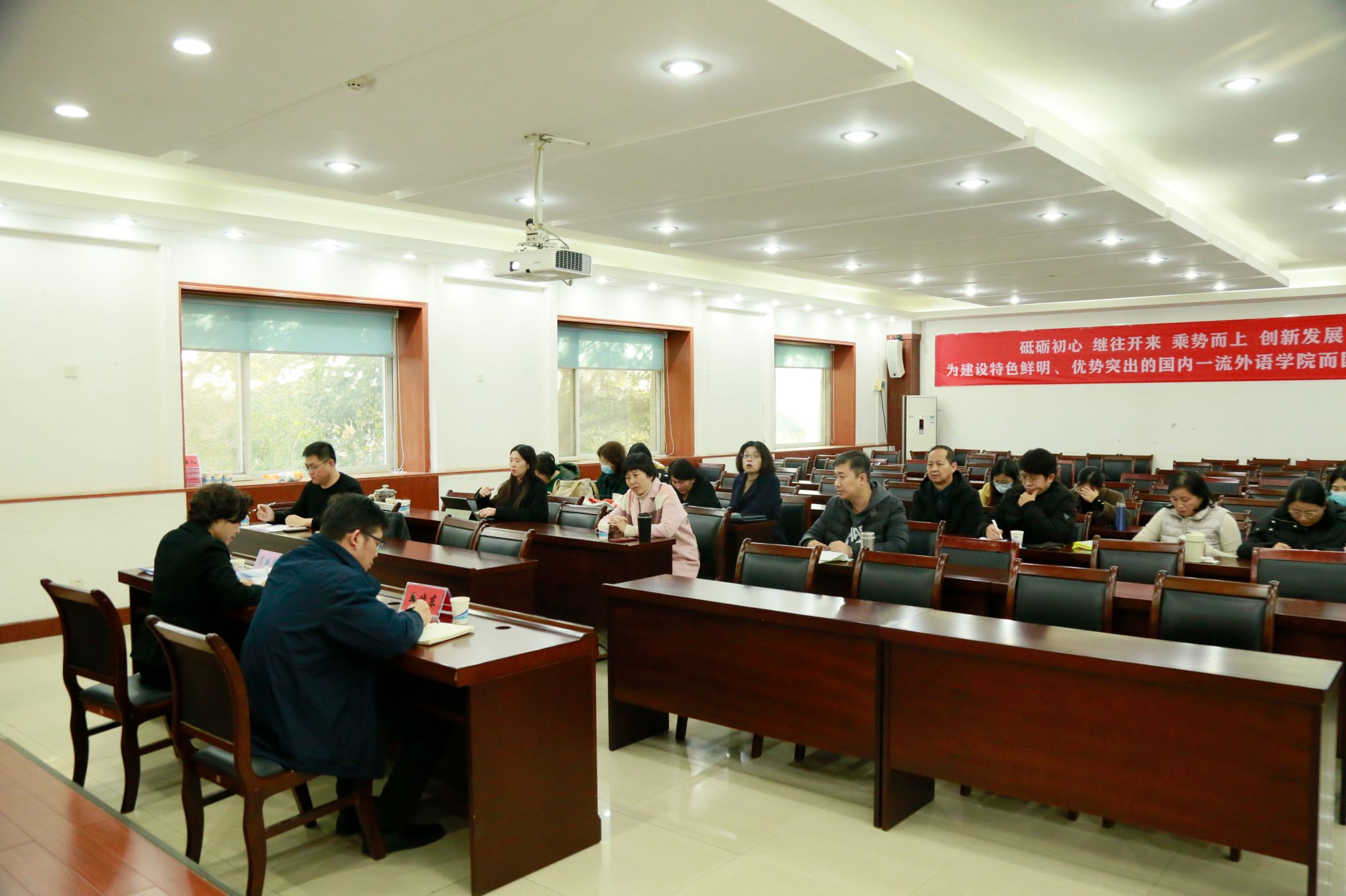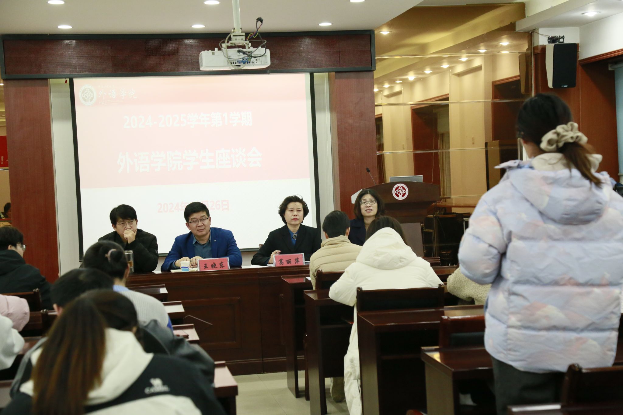 学生座谈会上,学生代表踊跃发言,建议增设跨学科拓展类课程,丰富教材选用,合力设置课程的学时和学分,强化口语、听力练习等,大家讨论热烈互动有效。