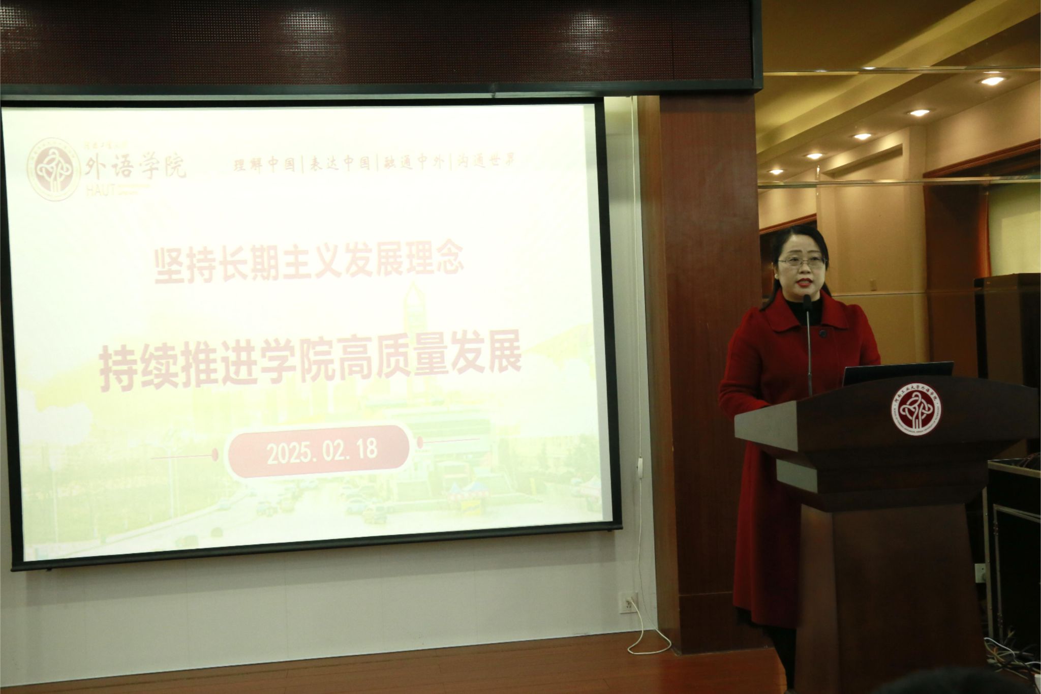 院长黄辉辉以《坚持长期主义发展理念 持续推进学院高质量发展》为题作专题工作报告。她从学生工作、师资队伍与人事工作、教学工作、科研与社会服务工作、学位与研究生教育工作、对外合作与交流学科建设工作等七个方面简要总结了2024年学院亮点成绩,指出2024年在全院教职工共同努力下,学院圆满完成了各项目标考核任务,在河南省专业评价、科研项目立项、科研经费到账、师资队伍建设等方面均取得了突破。在肯定成绩的同时,她结合学院目前发展形势,深入分析了学院所存在的本科生升学率、本科生学术发表与科技创新纵横向科研经费到账、师生国际交流、财务创收等五个方面不足,并提出针对这些不足学院拟采取的主要措施及改进举措。在分析总结近几年学院主要发展思路的基础上,她提出2025年学院发展思路。围绕学生终身发展、持续发展、面向未来,构建“教、学、研、创、服”一体化人才培养模式的长期主义教育理念;以创造价值为目标、以系统思维为指引,持续投入、持续努力、持续迭代,以学院与师资的转型,促进学院可持续发展的长期主义发展理念;坚持目标导向、内涵导向、质量效率、匠心精神,以追求高效、务实的管理文化,构建追求卓越学院文化的长期主义管理理念。最后她号召全体教职工齐心协力、奋勇拼搏、共谋发展、追求卓越,共同推进学院事业高质量发展。