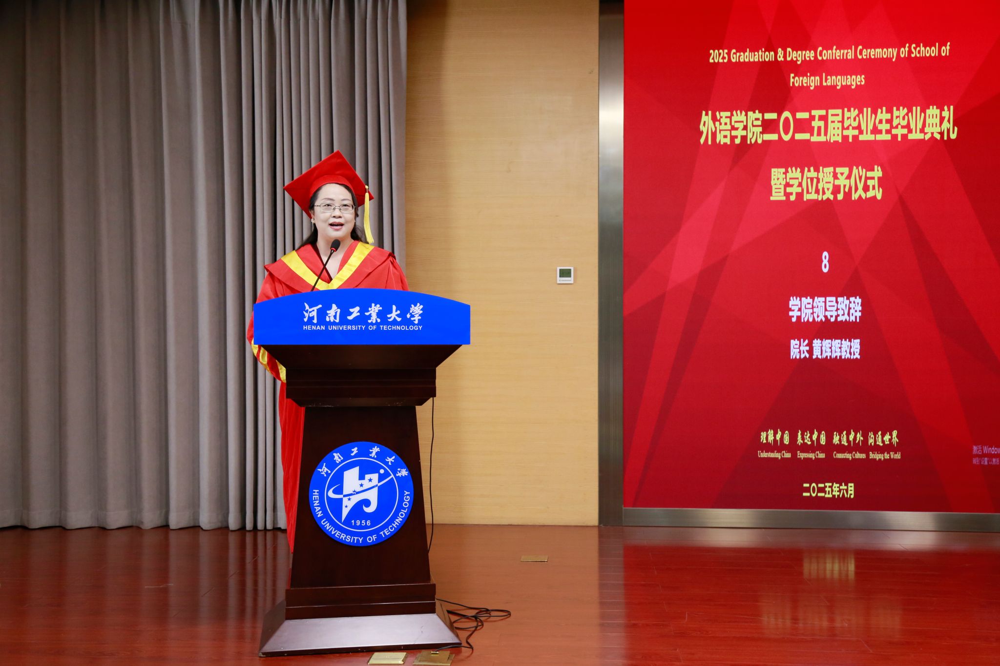 院长黄辉辉代表学院向圆满完成学业、即将开启人生新篇章的2025届全体毕业生表示祝贺。同时提出三点希望:一是希望毕业生向内探索:遇见更丰盈的自己;二是希望同学们向外探索:融入更鲜活的社会;三是希望大家向上探索:拥抱更辽阔的文明。