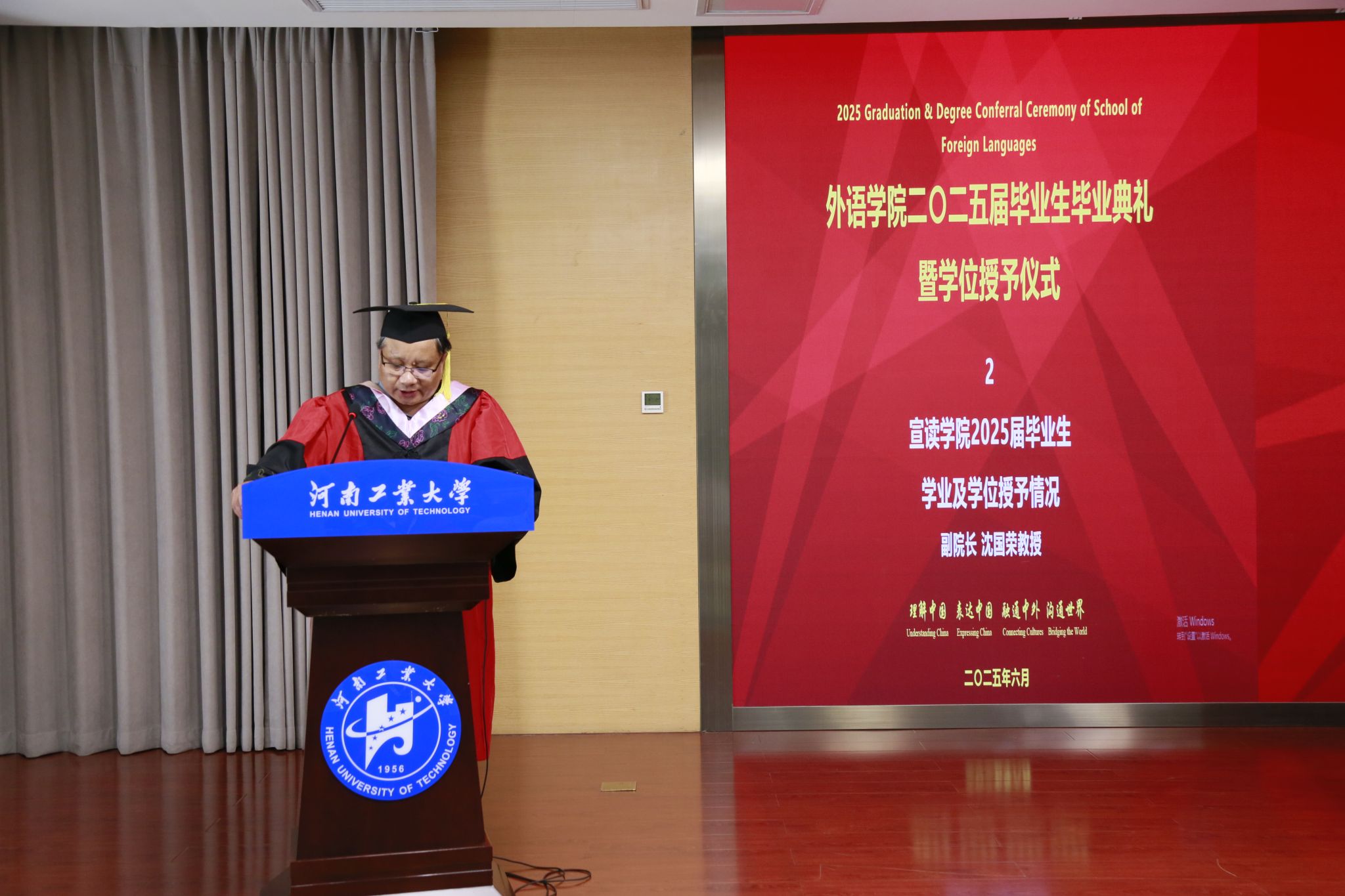 副院长沈国荣教授介绍学院2025届毕业生基本情况及学位授予情况。副书记王晓东宣读表彰优秀毕业生的决定。出席典礼的领导和老师为受表彰的优秀毕业生颁发了荣誉证书。