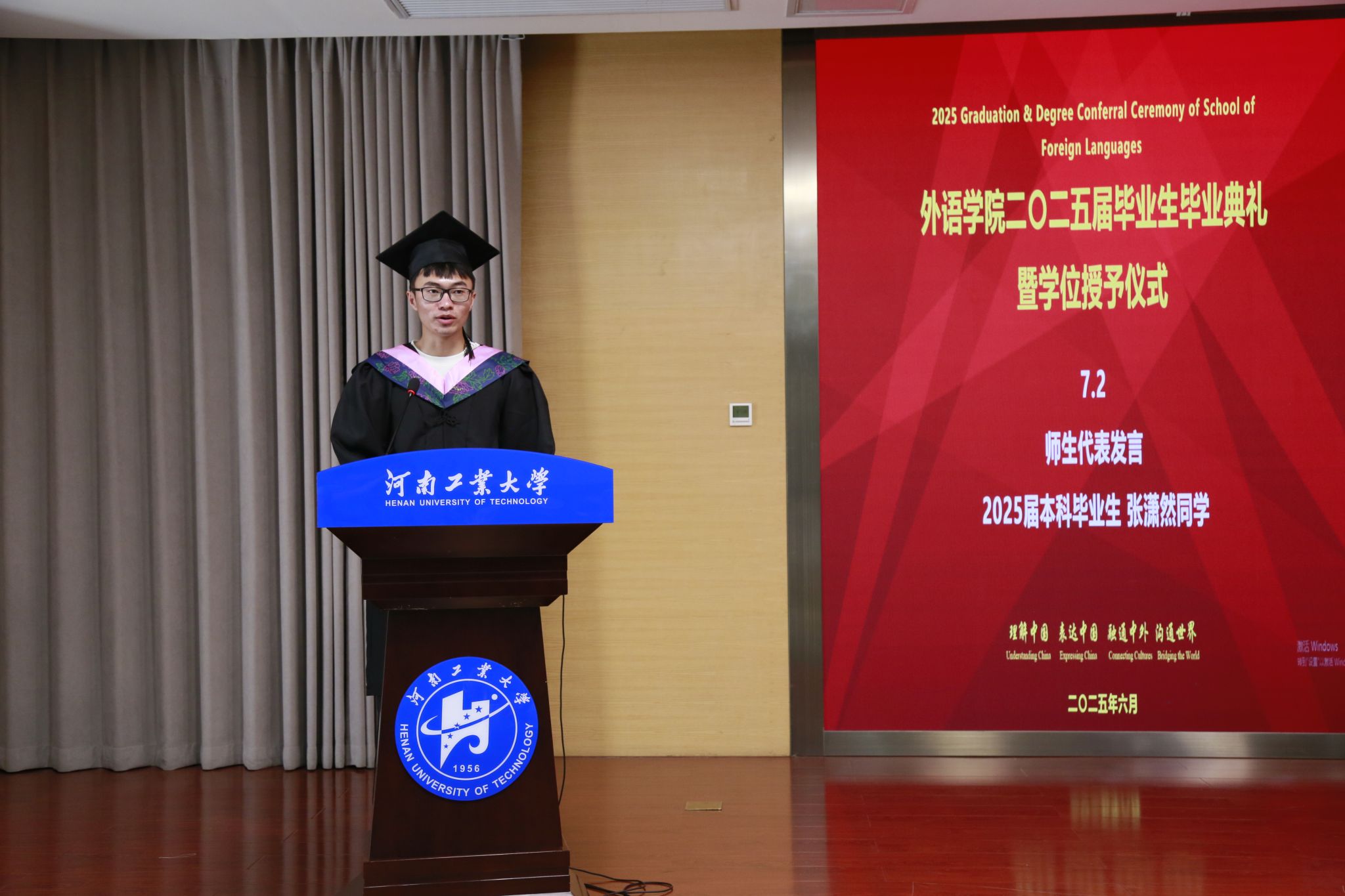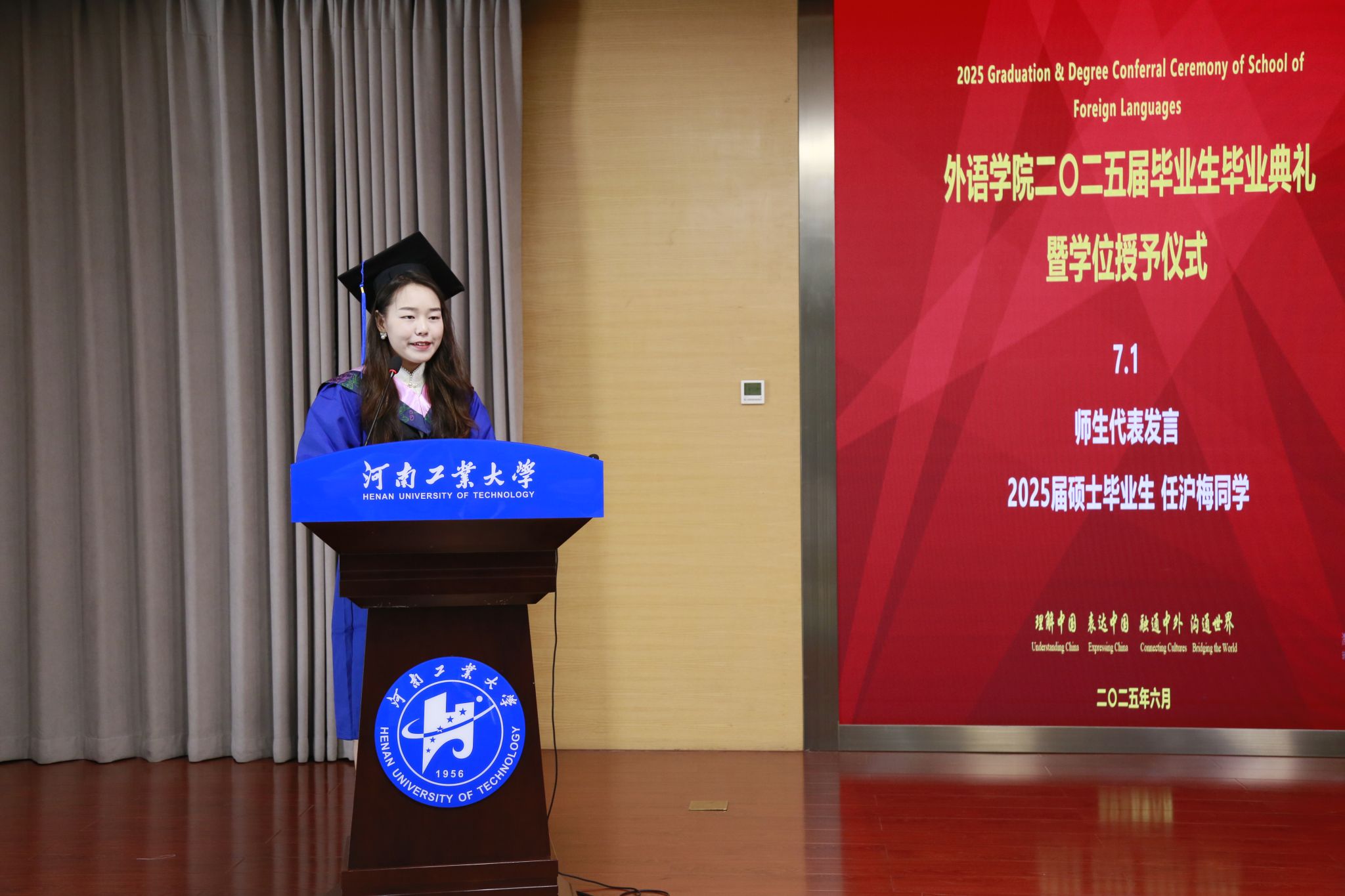 求学的光阴,如流水般逝去,同窗的情谊,似磐石般永恒,几年的求学生涯承载着同学们太多的回忆。毕业生代表2021级本科生张潇然、2022级学术学位研究生任沪梅依次发言。他们分享了自己在捷克论坛
