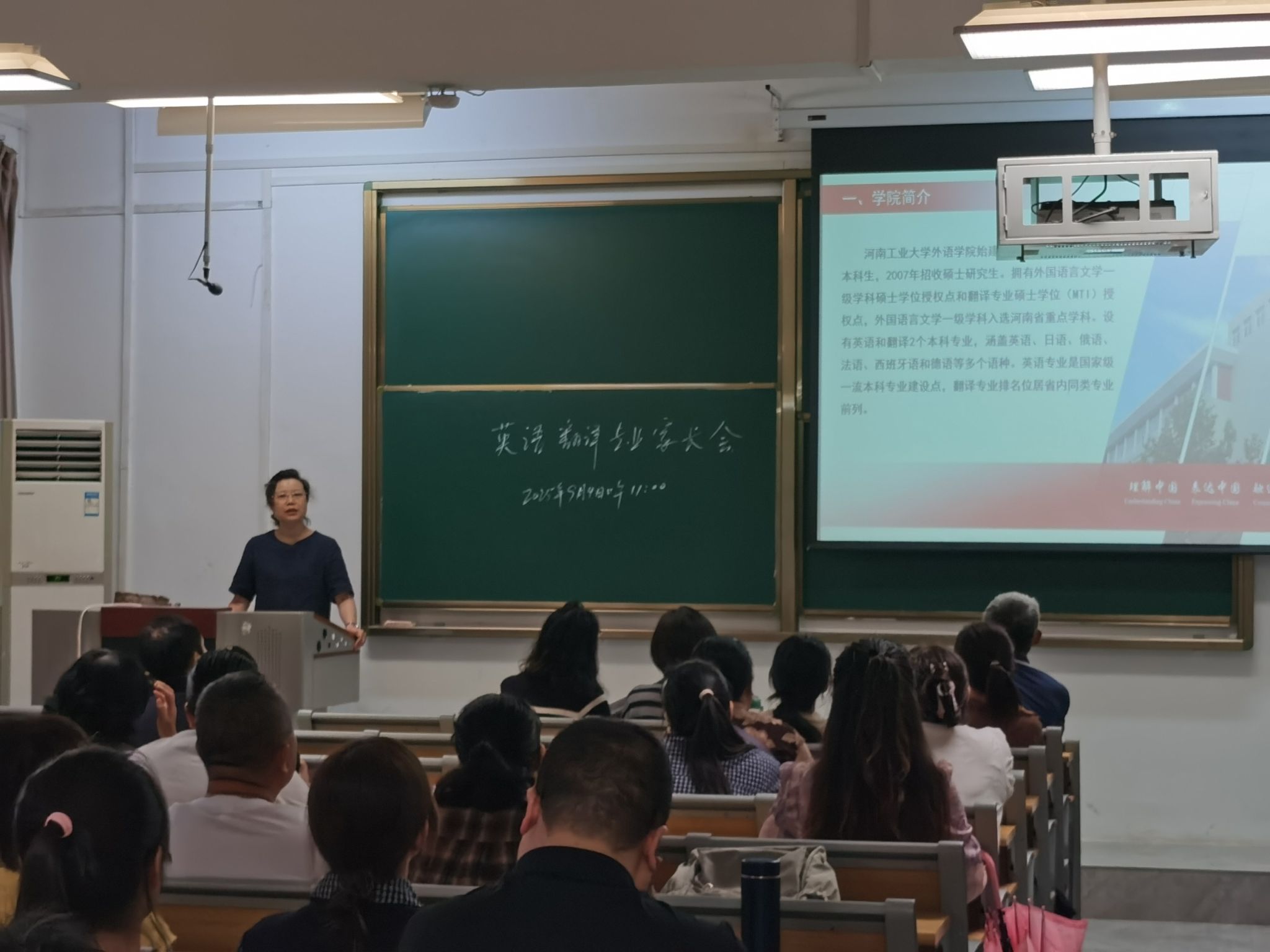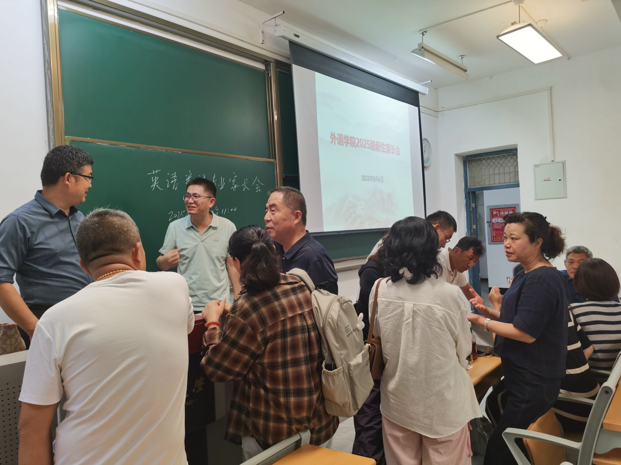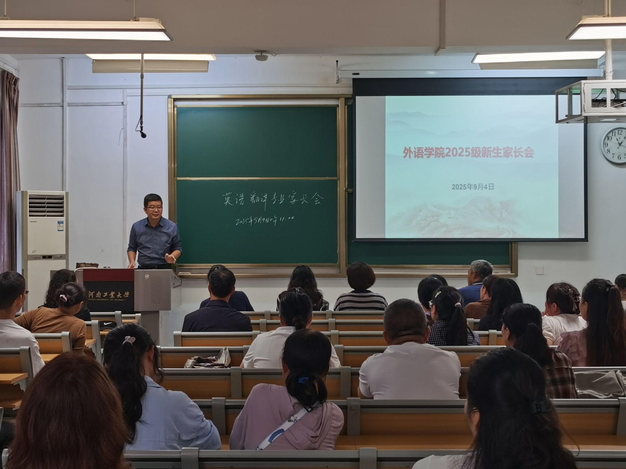 2025级新生家长会在嵩山路校区1号教学楼219教室召开,学院党委副书记王晓东、副院长葛丽萍、英语系主任康方、翻译系主任靳亚铭、学工办主任郭珊珊和新生家长参加了会议。会议由副书记王晓东主持。