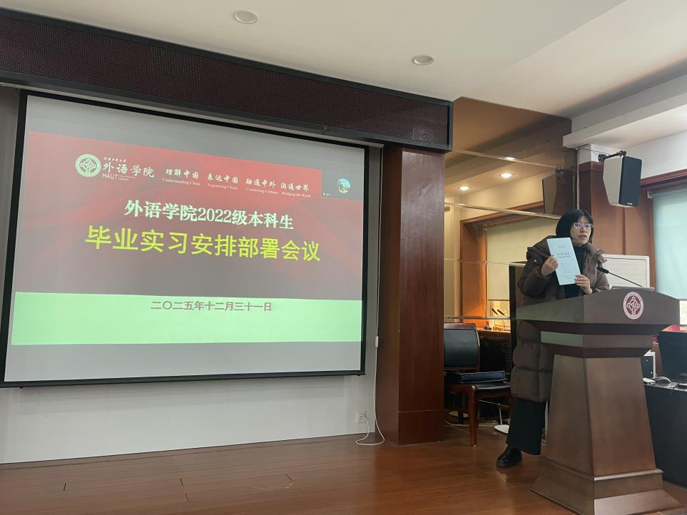随后,翻译系主任靳亚铭围绕实习期间的具体事项作了细致讲解。靳主任结合往届实例,为同学们阐述了实习日记、总结报告等材料的撰写方法与注意事项,通过规范、认真地完成各项材料,将实习切实转化为个人专业能力成长的契机。针对2026届毕业生即将面临的专业八级考试,她提醒同学们要科学规划时间,将实习实践与专八备考有机结合,实现实践能力与应试水平的双向提升。同时,要与毕业论文及实习指导老师保持常态化沟通,准确把握论文撰写的重要时间节点,统筹协调好实习、专八备考与毕业论文三项任务,确保各项学业目标高质量完成。