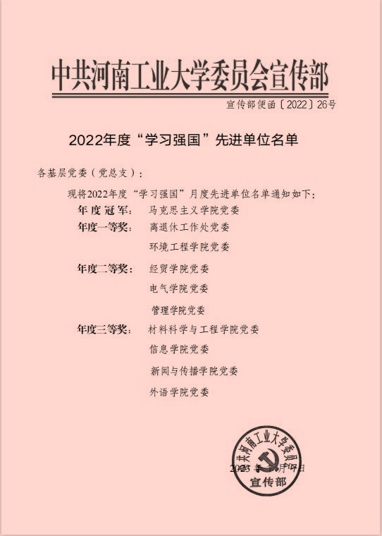 党委对2022年度“学习强国”学习先进个人予以通报表彰。