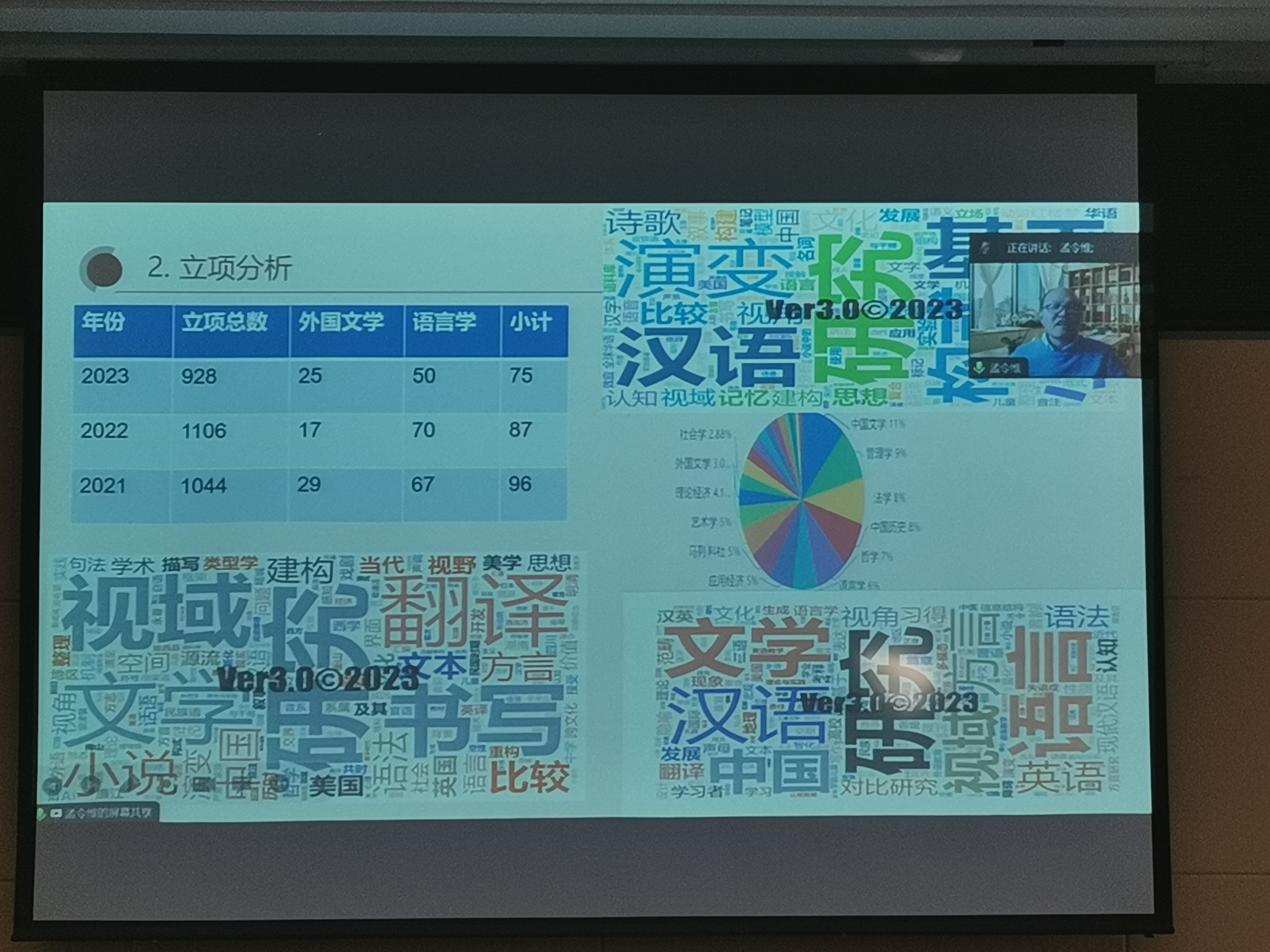最后,黄辉辉从学术规划、申报策略、项目选题和项目论证四个方面对学院2024年度各类国家级项目申报工作进行了整体部署。她鼓励教师们做好自身学术发展长期规划,及早聚焦稳定学术研究方向和研究领域,走出书斋,走进社会,关心时事,关心民生,深入社会进行广泛调研,寻找真问题、凝练真课题。选题应紧密围绕如何服务国家重大发展战略及需求,积极与其他学科进行交叉融合,服务学科建设与学术创新。同时,应分赛道、强积累、多论证,围绕同一研究领域积极尝试国家社科基金面上项目、后期资助项目、中华学术外译项目,坚持积累以形成系列具有高显示度的研究成果。她表示,学院将采取邀请专家线上论证、一对一精准深度指导论证、团队内部论证和学院论证结合等方式为申报教师提供全方位支持,力争学院在2024年度国家级项目立项上再创佳绩。