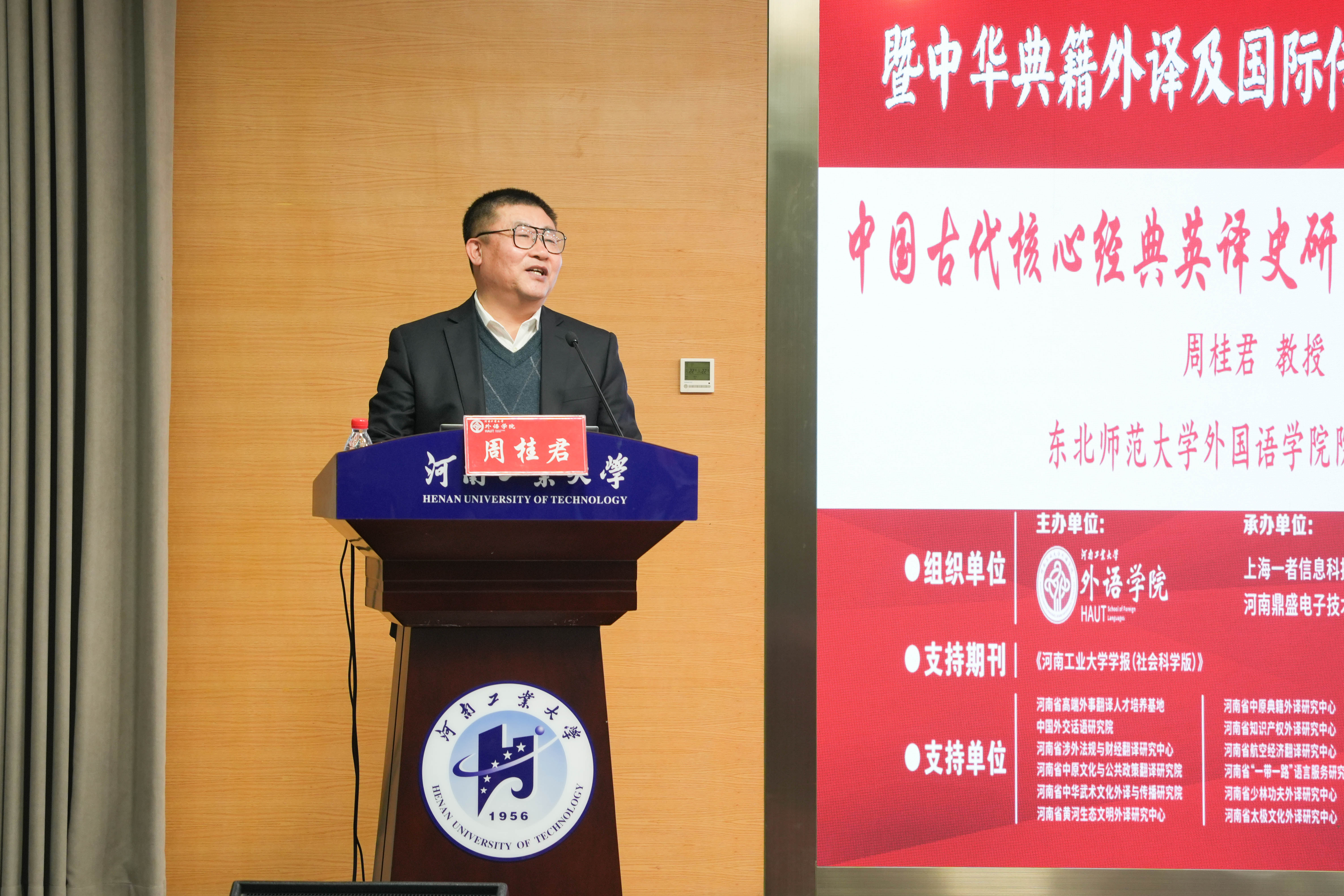 东北师范大学外国语学院院长周桂君教授主旨发言题目为《中国古代核心经典英译史研究及数据库建设》。他指出,中国古代核心经典是中国传统文化的重要载体,其翻译在中外文化交流史上扮演着重要的角色,经典重译具有极大重要性与迫切性。他全面梳理了五部中国古代核心经典《易经》《道德经》《论语》《庄子》《孟子》的英译史、传播主体与传播效果,并分享了对五部核心经典英译进行数据库建设的经验。