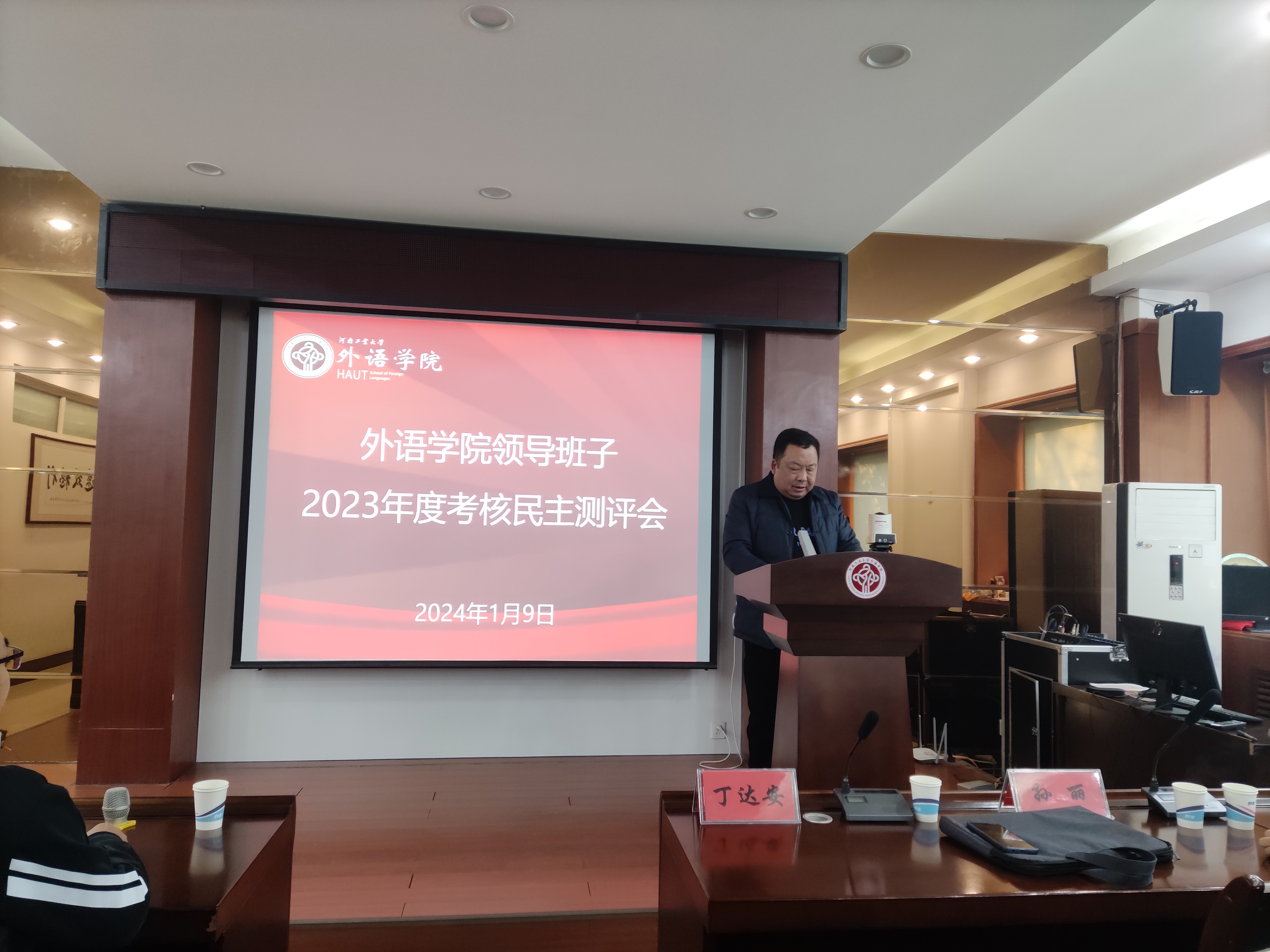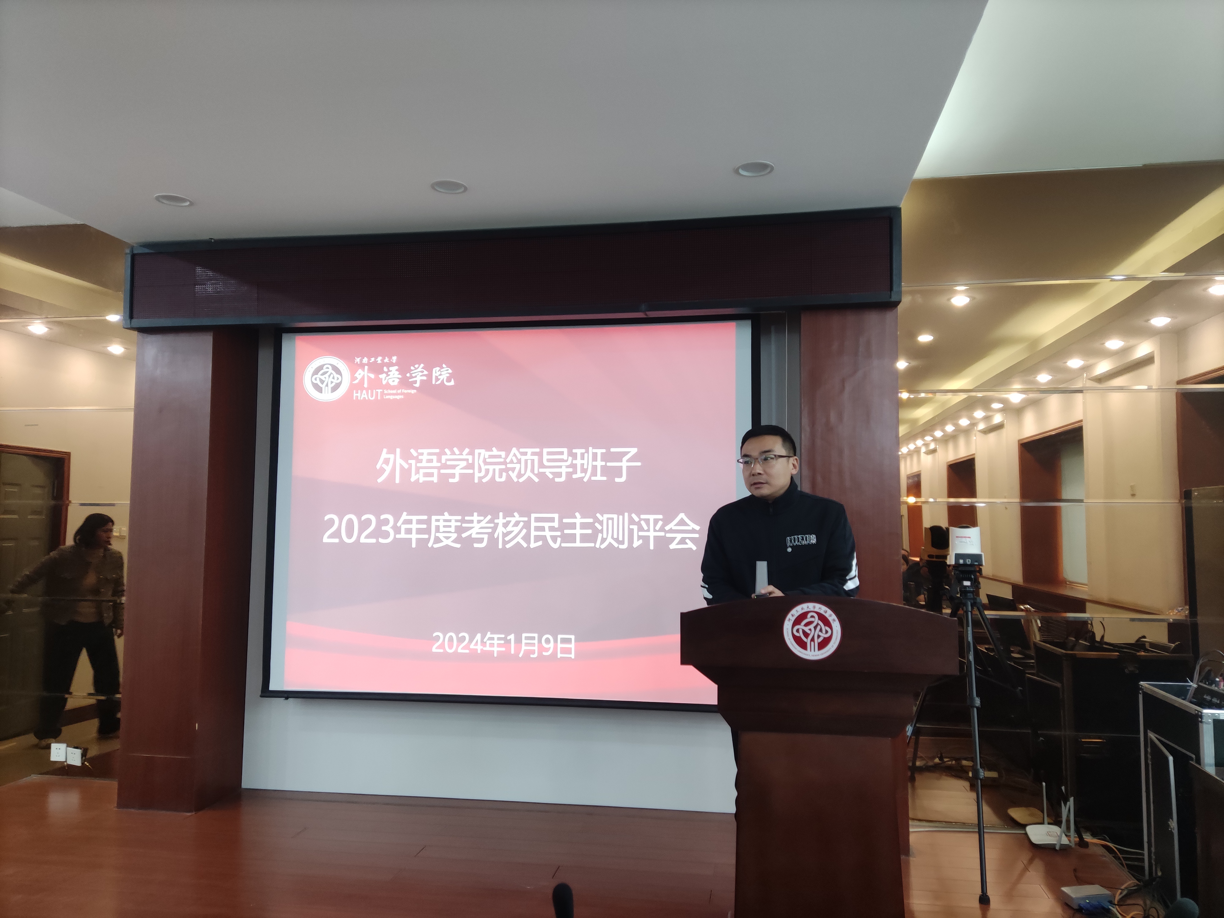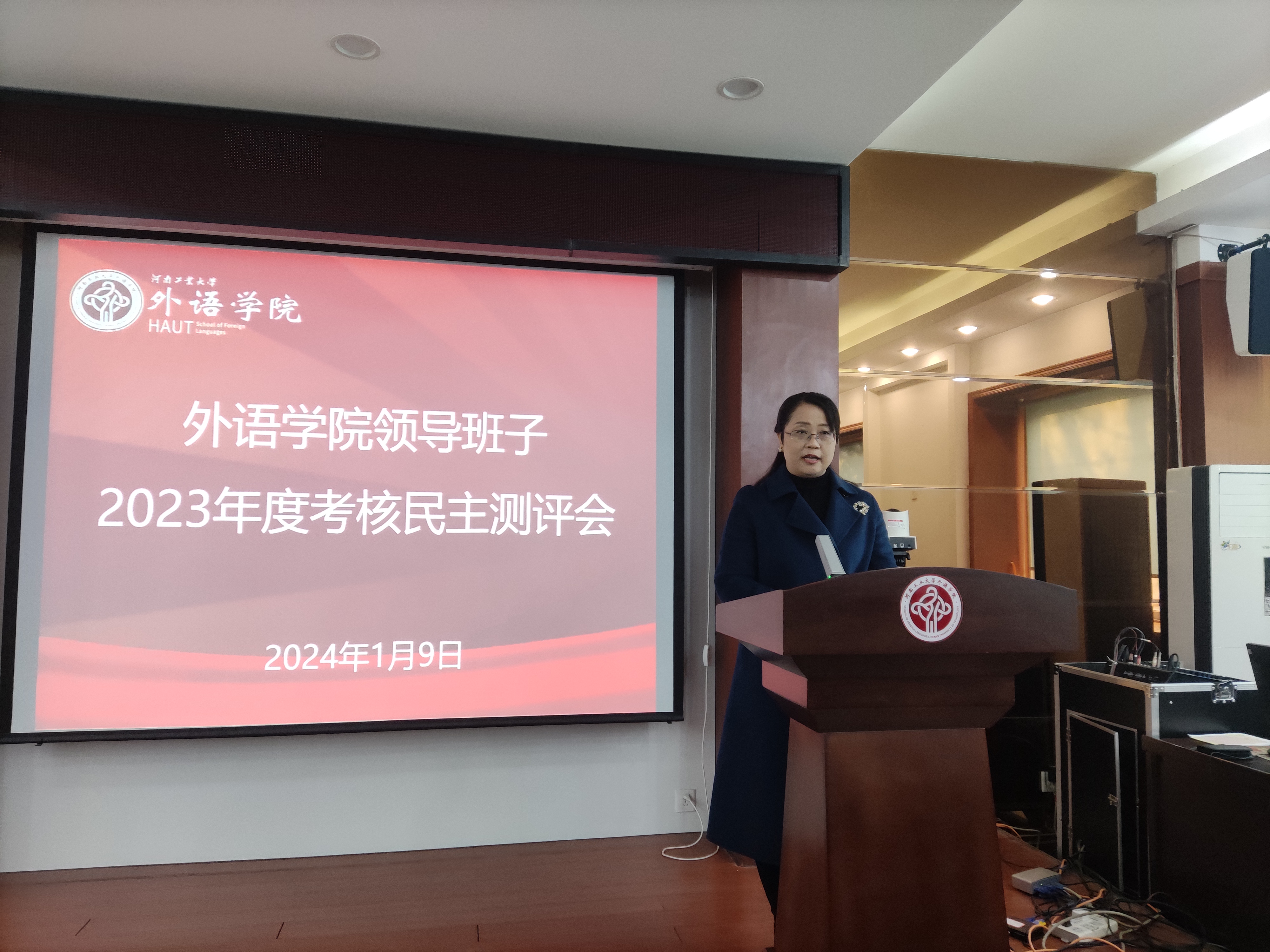 院长黄辉辉代表学院领导班子作述职报告。她从党建、教学工作、学科建设、学位点与研究生、学生工作、科研与社会服务等方面,全面回顾总结了学院2023年工作情况。她讲到2023年学院获批国家社会科学基金项目2项,发表A类和B类权威期刊论文2篇。新增到账科研经费为60.3万元,取得了历史性突破;学院外国语言文学一级学科,通过河南省第九批重点学科验收,并获批新一轮河南省重点学科立项;成功举办第三届全国“翻译技术教学科研创新”暨中华典籍外译及国际传播专题论坛,获人民日报、学习强国、河南日报等诸多媒体的报道,极大促进了学校、学院社会声誉和学术影响力的提升。她表示这些成绩的取得与学院全体教职工辛勤工作密不可分,她代表学院领导班子向全体教职工表示感谢,希望大家再接再厉,在2024年共同开创捷克论坛