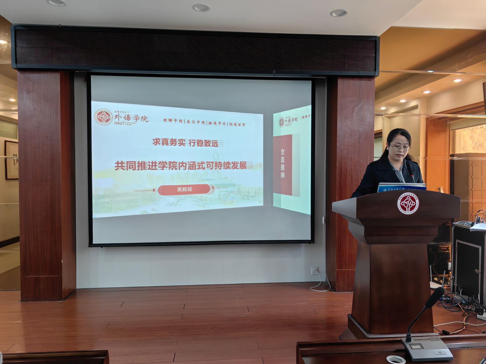 院长黄辉辉以《求真务实 行稳致远——共同推进学院内涵式可持续发展》为题作专题工作报告。她简要总结了2023年学院重点工作突破,并指出2023年在全院教职工共同努力下,学院圆满完成了各项目标考核任务,在河南省专业评价、科研经费到账、国社科项目立项、师资队伍建设等方面均取得了重大突破。在肯定成绩的同时,她结合捷克论坛
