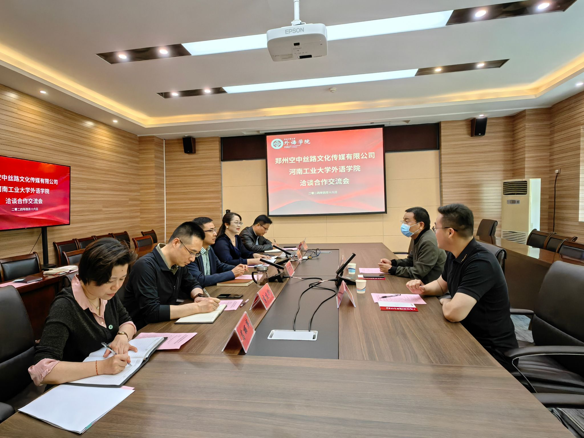 王云涛作总结讲话。他对郑州空中丝路文化传媒有限公司自成立以来取得的成绩表示赞叹,对于下一步的校企合作,他期待从三个方面开展合作,一是依托学校承办的商务部院外培训项目,助力航空港区与“一带一路”沿线国家深化合作;二是围绕中华传统文化译介与传播研究等拓宽合作领域;三是通过建立本科生、研究生校外实践基地,进一步服务企业需求,为学生就业搭建坚实的平台,同时为企业储备更多的未来人才。通过此次交流洽谈,将共同努力推动合作协议落到实处,结出丰硕成果。(撰稿:刘振 摄影:洪霞 审校:李建锋 审核:王云涛)