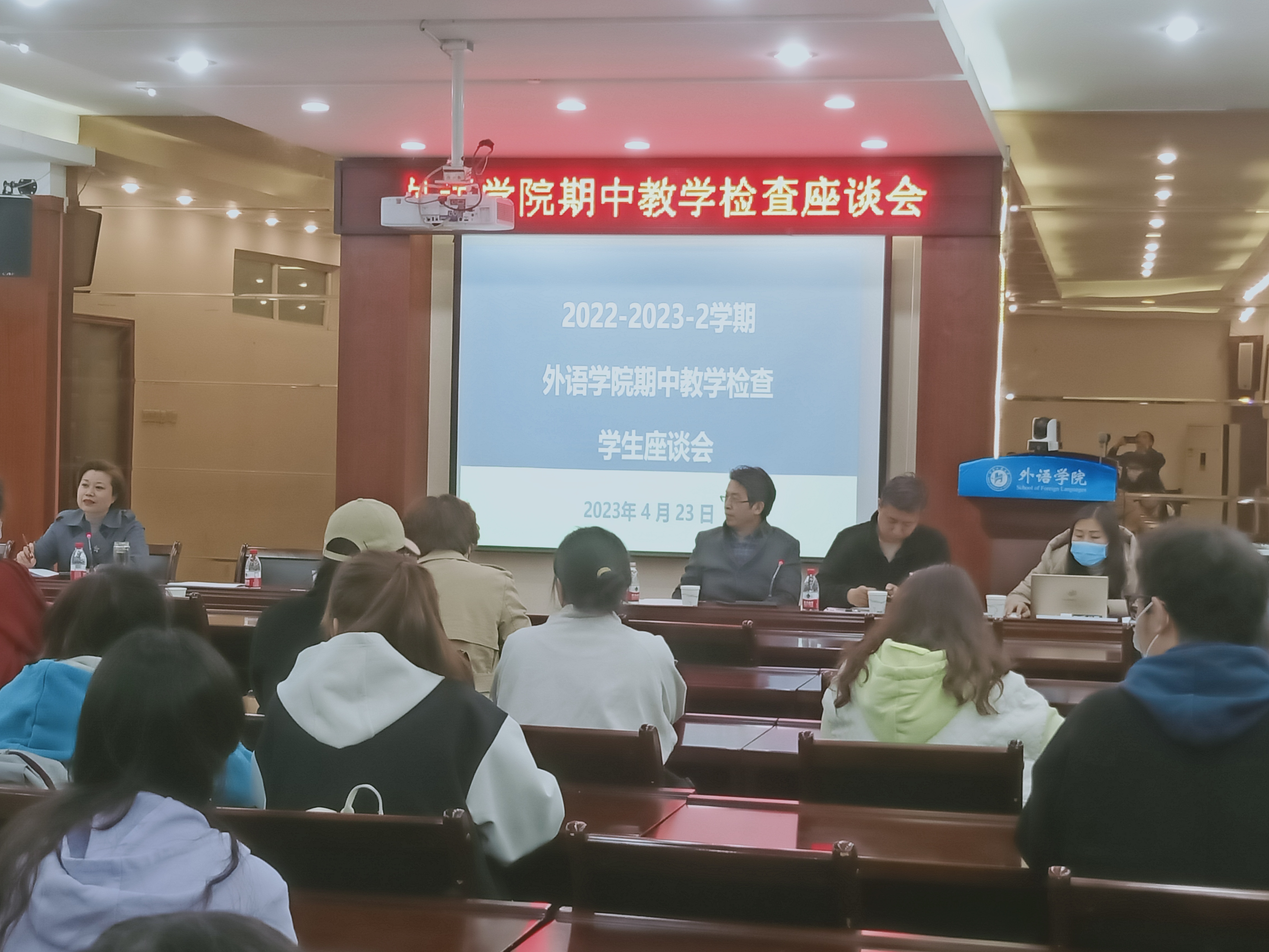 在5225会议室召开了本学期期中教学检查师生座谈会。学校督导组专家穆中杰教授、教师教学发展中心赵静主任、学院领导班子、教学办、学工办、本学期任课教师和学生代表参加了座谈会。会议由副院长葛丽萍主持。