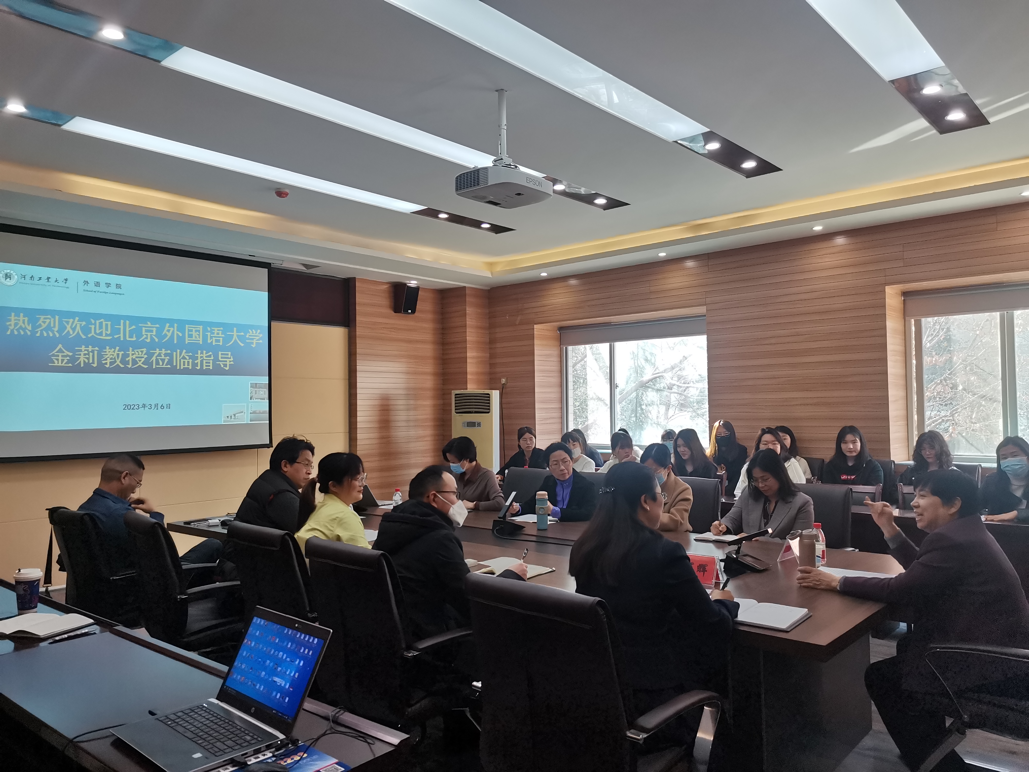 金莉教授指出,高校外语教师应主动肩负起其职业使命与时代使命,充分结合外国语言文学学科的特点与优势,使外语学科真正成为使用外语进行教学与研究的学科,在推动中国更好走向世界、世界更好了解中国上做出贡献,更好践行高教教师应肩负的人才培养、科学研究、社会服务、文化传承创新和国际交流合作的使命。外国语言文学学科包含外国语言学及应用语言学、外国文学、翻译学、比较文学与跨文化研究和国别与区域研究五大研究领域,高校外语教师应深入了解外国语言文学学科不同领域与方向的研究内容与特点,及早做好学术规划,保持科研方向的稳定性,深耕选定的学术领域。金莉教授强调,高校教师要做学者型的教师,不仅要有出色的教学能力,还要有杰出的科研能力。要坚持不断读书、持续做科研,并将科研成果反馈教学进而改进教学,提高人才培养质量。要抓住学术研究的黄金时期,坚持在聚焦领域进行深入的学术阅读,积极撰写学术论文,申报研究课题,参加学术会议,如此才能关注学术研究最新动态与趋势,在所深耕的领域有所作为与成就。最后,金莉教师与学院师生展开了热烈的互动,耐心解答了师生们在教学和科研过程中遇到的困惑与问题。会后,金莉教授对学院2023年度国家社科基金申报项目申请书给与了深入的指导,并提出了建设性的建议。
